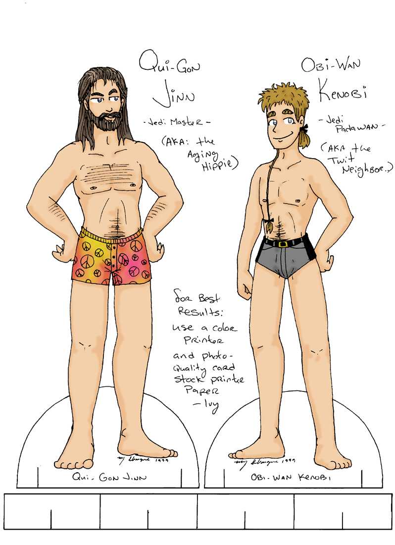 Check out Ivy's paper dolls! Download and print out Obi-Wan and Qui-Gon (78 KB), and Sidious and Maul (79 KB) - Ivy says "It looks great printed out on 8" x 11" photo paper - glossy or non-glossy (it's a heavier card stock paper, so you won't have to glue the dolls to any card stock when you cut them out) on the best quality 720 dpi to 1440 dpi (recommended)." Then download some groovy clothes ("The clothing looks fine on standard 8" x 11" paper at 360 dpi to 720 dpi."): Obi-Wan page one (95 KB), Obi-Wan page two (82 KB), Qui-Gon page one (90 KB), Qui-Gon page two (90 KB), Palpatine page one (78 KB), Palpatine page two (79 KB), Maul page one (82 KB), and Maul page two (78 KB).